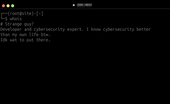 -(root@site)-[~] -$ about I am a cybersecurity expert (maybe but I think so), I have learned it doing some shit and coding shitty code and apps.